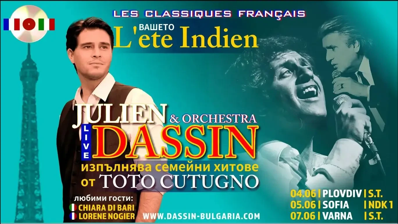 "L'Été indien, Salut" , "Et si tu n'existais pas", "Et L'Amour S'En Va", "Le Jardin Du Luxembourg" и много други незабравими романтични хитове. Тото Кутуньо е написал общо 13 песни за Джо Дасен. В уникален автентичен спектакъл ще чуете от тях и другите най-обичаните и трогателни френски песни в света, изпълнени от Жулиан Дасен и неговите гости, певиците с магически гласове Лорен Ножие (Франция) и Киара ди Бари (Италия).
